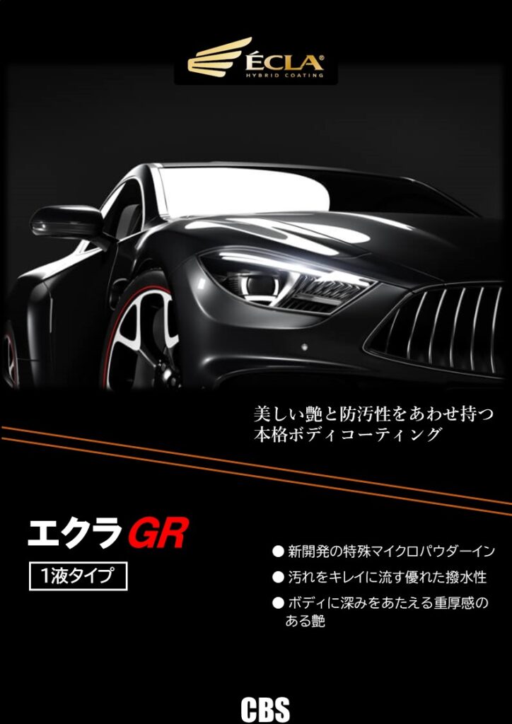 エクラGRは1液1コートタイプながら重厚感のあるツヤと抜群の撥水力を兼ね備えています。GRとは「ガラス~レジン」の略称で、レジンの樹脂ガラスを主成分とすることでより厚みのある被膜を形成することができます。